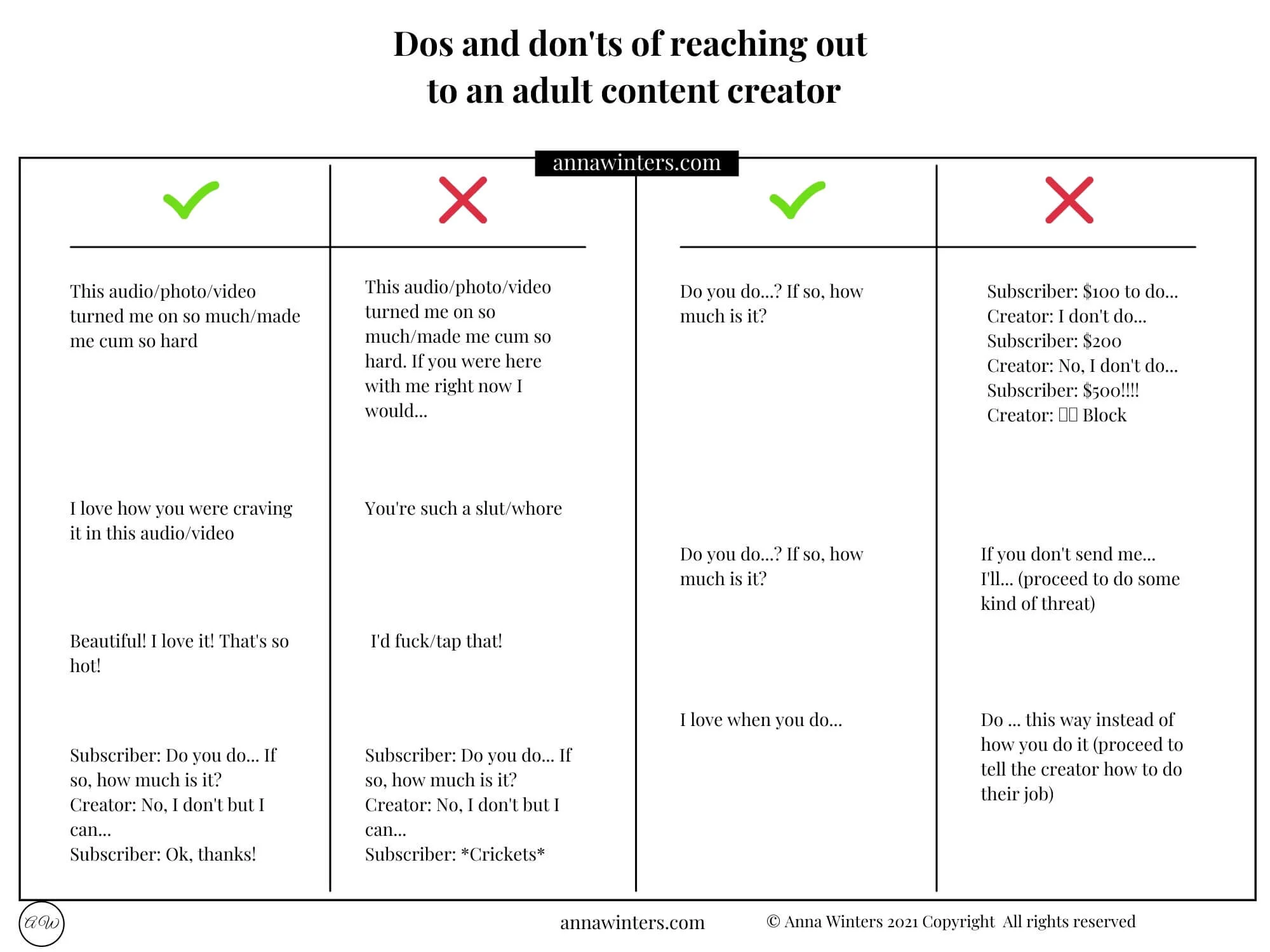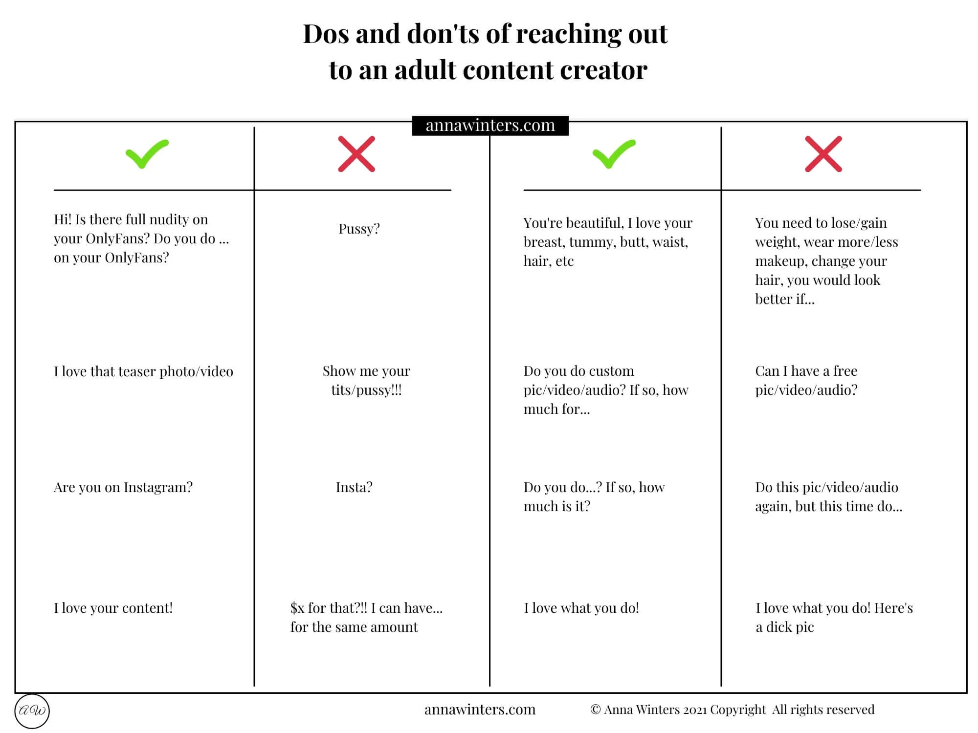 However, I don’t want you to feel weird about reaching out, so I created this Dos and don’ts of reaching out to an adult content creator guide you can find below. If it’s on the green checkmark side you can say it to me. Of course, I can only speak for myself, so keep in mind that everyone is different and that not every creator would be comfortable with everything I added to the okay list.